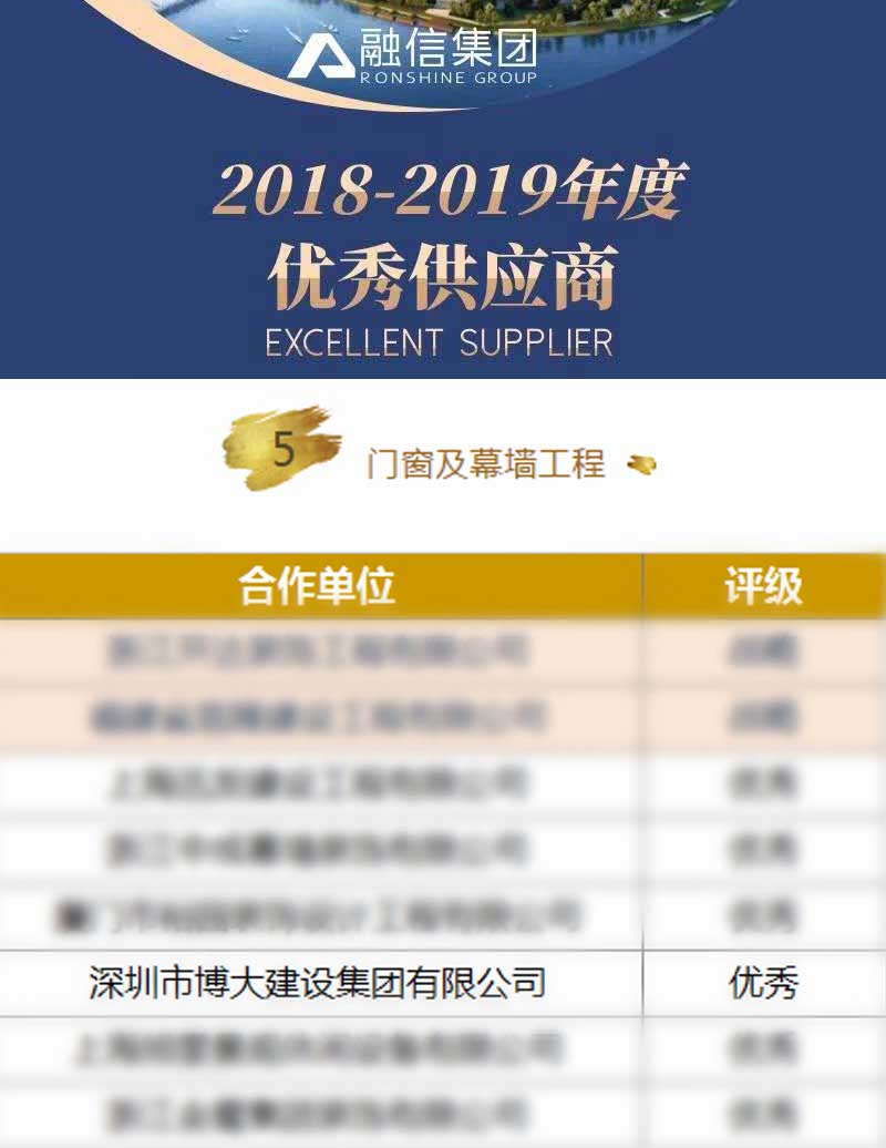 博大建設(shè)集團(tuán)在2018-2019年度成績突出,榮獲融信集團(tuán)頒發(fā)的門窗及幕墻工程“優(yōu)秀供應(yīng)商”稱號。融信集團(tuán)創(chuàng)立于2003年,總部位于上海,是中國房企20強(qiáng)。