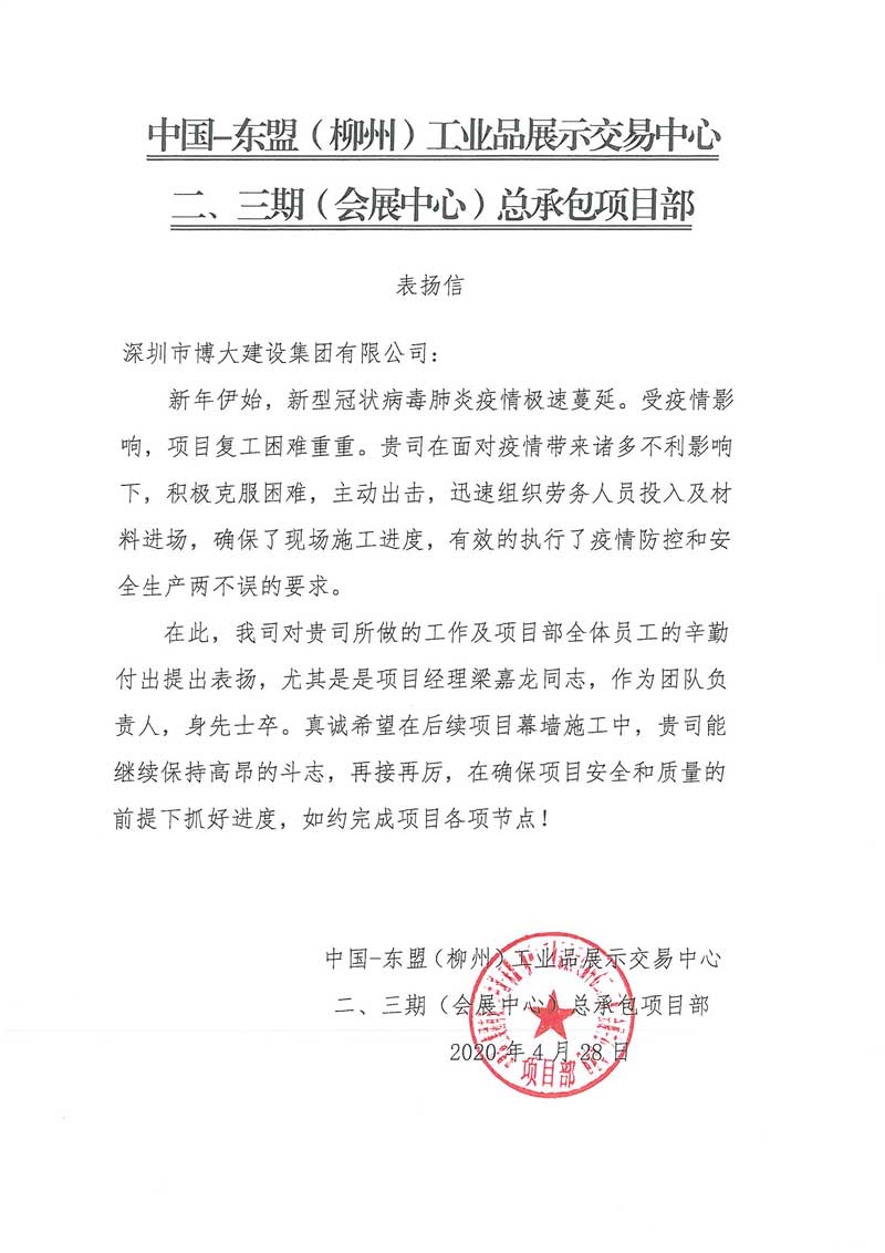 博大建設(shè)集團(tuán)在中國-東盟(柳州)工業(yè)品展示交易中心二、三期(會展中心)項(xiàng)目中,積極克服疫情造成的困難,主動出擊,確保了現(xiàn)場施工進(jìn)度,有效的執(zhí)行了疫情防控和安全生產(chǎn)兩不誤的要求,獲得客戶表揚(yáng)。